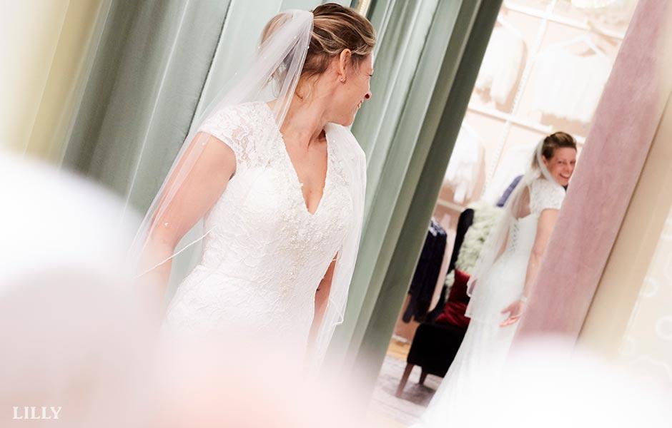 Perfekt arrangierte Ruhezonen mit Tischen, Sesseln und großzügigen Umkleidekabinen, schaffen individuelle Nischen, in denen Sie und Ihre Begleiter ungestört das Hochzeits- oder Fest-Outfit aussuchen können. Dabei steht Ihnen ein erfahrenes Fachpersonal solange mit Rat und Tat zur Seite, bis leuchtende Augen verraten: Ja, das ist es!