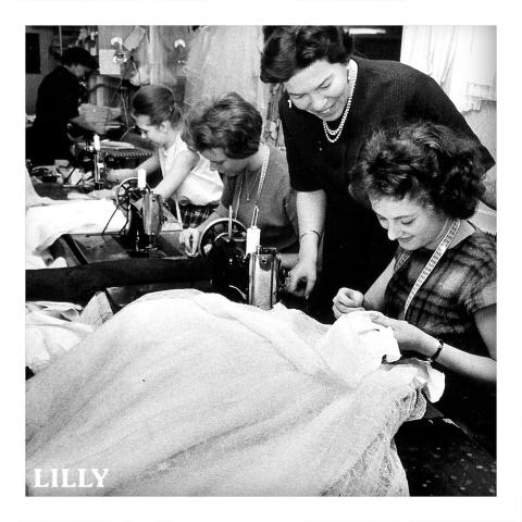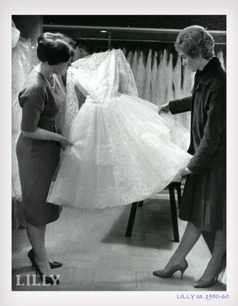 In the beginning, Lilly recreated ladies' wardrobes, e.g. suits, dresses or jackets. She was not only a gifted businesswoman but also an incomparable design talent with a lot of craftsmanship and a great love for details. One of the first customers who entered, was a young lady and her mother, who placed an order for a wedding dress, to be made out of an english silk parachute that they had saved. This became the starting shot for LILLY's success story: for those who wanted to wear a new weddingdress in the post-war period - a time when clothing and fabrics were very rare and precious - it was important to find a company, that could accomplish the miracle of making five-meters of fabric look like 30! Word quickly spread, and during the next ten years brides from all over Denmark came to Vejle to have their weddingdress made by Lilly. And soon she concentrated entirely on bridal and evening wear as the core business of the newborn "LILLY" brand.